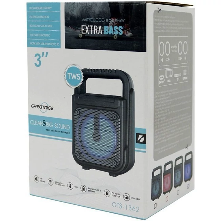 اسپیکر پرتابل GTS-1362 را می توان به شکل ایستاده به کار برد و علاوه بر بلوتوث با کارت حافظه و فلش مموری سازگاری دارد و همچنین وجود یک ساب 3 اینچی باعث شده است تا بتوانید از قدرت صدای شگفت انگیز بهره ببرید، ویژگی شگفت انگیز دیگر این اسپیکر، وجود یک رقص نوررنگی در هنگام پخش موزیک است. با توجه به سایز بسیار مناسب آن و قابلیت جایگیری در کوله پشتی و چمدان گزینه بسیار عالی برای مسافرت و کمپینگ و همچنین استفاده داخل خودرو و قطار و... میباشد.